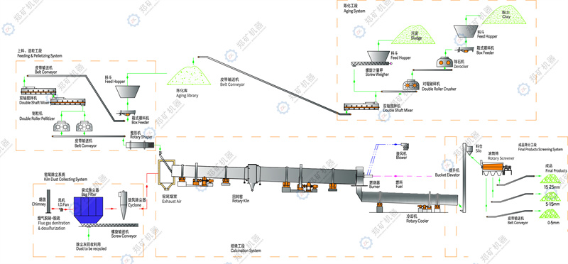 陳化后的混合料被鏟車送到料倉,然后經(jīng)過雙軸攪拌機攪拌后,送到對輥造粒機擠壓制粒。產(chǎn)出的顆粒料球由皮帶輸送機送入整形篩分機,圓整處理后,小顆粒被篩出,合格的顆粒球被送入雙筒插接式回轉(zhuǎn)窯進行預熱和焙燒。燒制出的陶粒成品落入冷卻機冷卻后,再由回轉(zhuǎn)篩分成5mm、15mm、25mm三種規(guī)格的成品,各自存放在堆場存放,裝袋后發(fā)貨。冷卻機內(nèi)冷卻陶粒的自然空氣被加熱到500℃進入到回轉(zhuǎn)窯內(nèi)輔助燃燒,可以節(jié)約大量的燃料??梢圆捎玫練せ蚱渌N類的燃料,粉碎后的燃料被高壓風機送入回轉(zhuǎn)窯內(nèi)燃燒。窯尾的含塵高溫煙氣進入空氣冷卻器降溫后,進入袋收塵器凈化后排空。