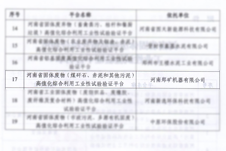 河南鄭礦機器有限公司榮獲河南省固體廢物高值化綜合利用工業(yè)性試驗驗證平臺稱號!