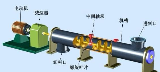 螺旋輸送機的發(fā)展經(jīng)歷了有軸螺旋輸送機和無軸螺旋輸送機兩種型式的演變過程。有軸螺旋輸送機由螺桿、U型料槽、蓋板、進、出料口和驅動裝置組成,而無軸螺旋輸送機則采用螺桿改為無軸螺旋,并在U型槽內裝置有可換襯體,結構簡單,物料由進料口輸入經(jīng)螺旋推動后由出料口輸出,整個傳輸過程可在一個密封的槽中進行。